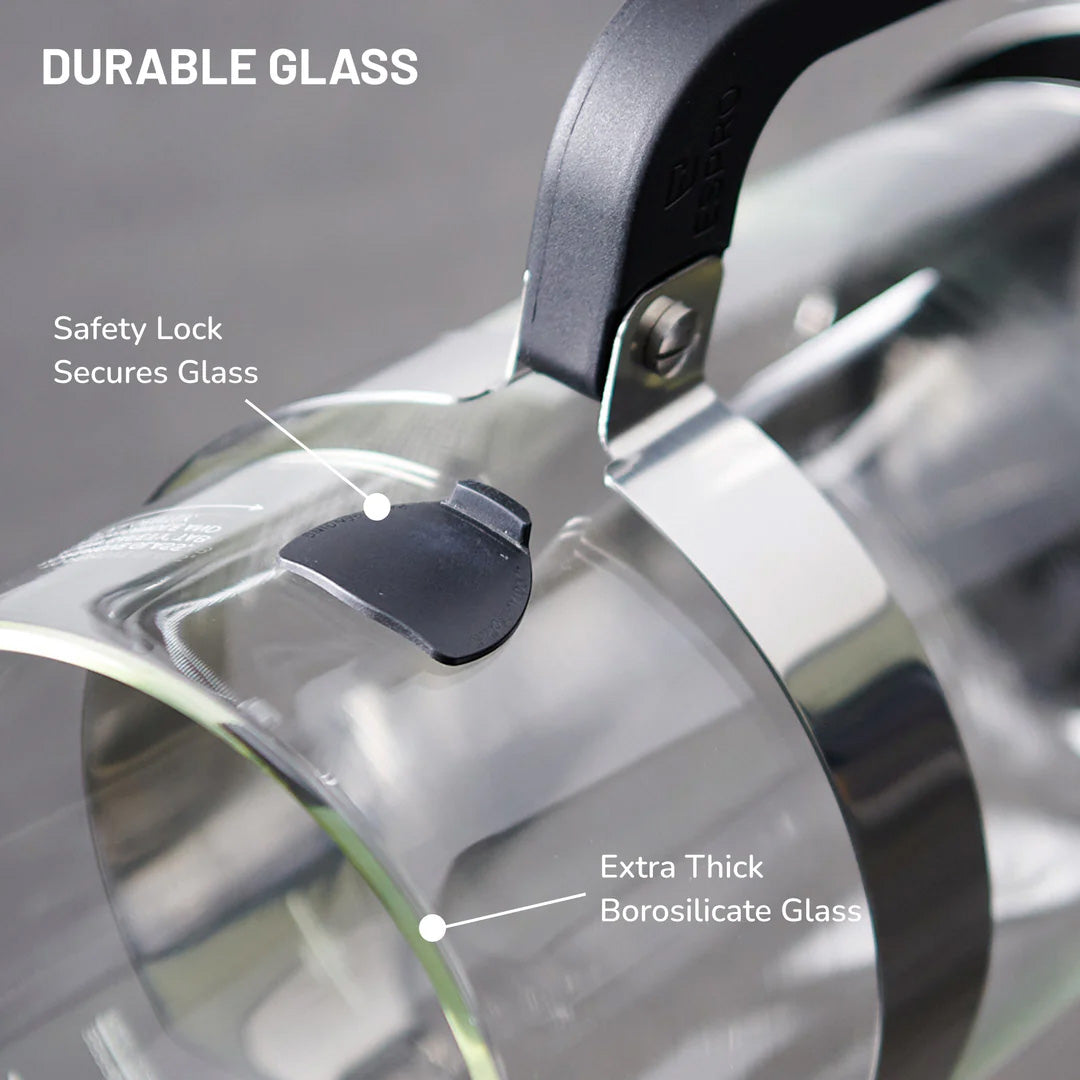 Not only is it durable, but it's held in place using sliding Safety Lock technology that helps prevent spills and shatters so that you're free to watch the magic unfold as your handful of grounds turns into the perfect cup of coffee.